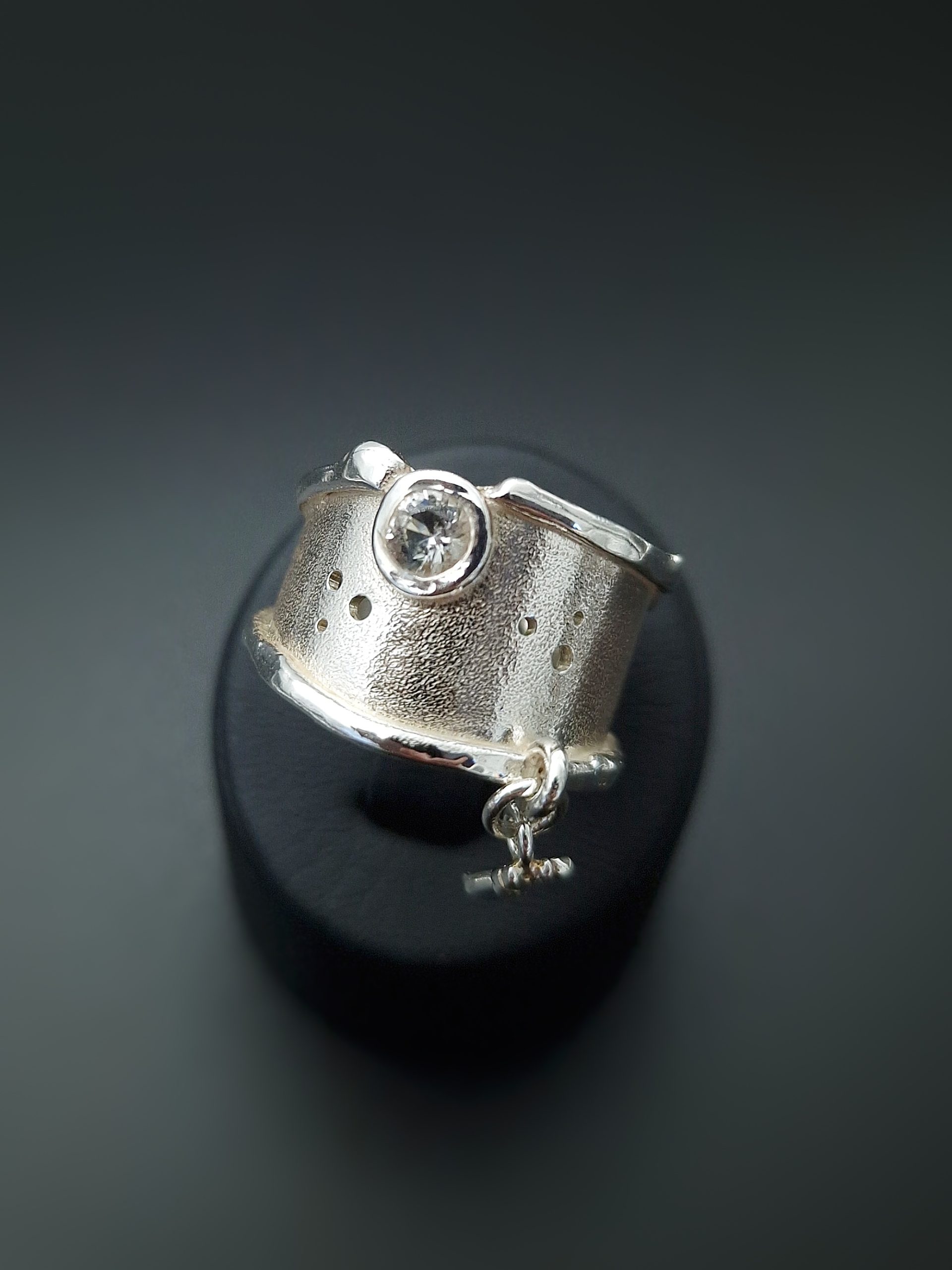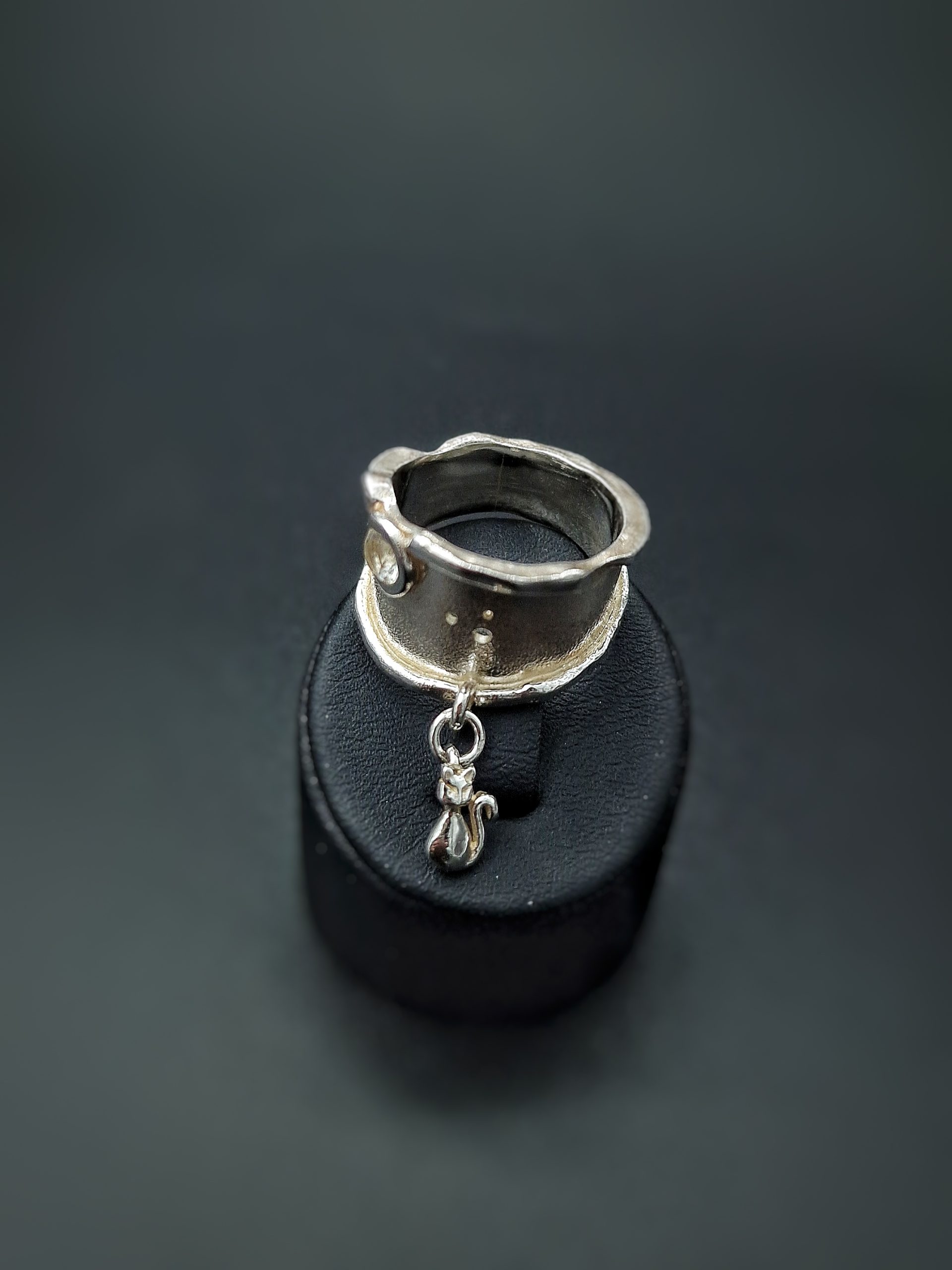 Crazy Cat – Kraftig håndlaget ring i sølv, med cz og dinglekatt. Denne er utrolig kul på, skikkelig statement. Størrelse : ca 60 Bredde topp: 16 mm Kun ett eksemplar.